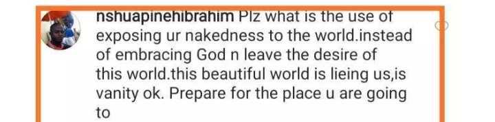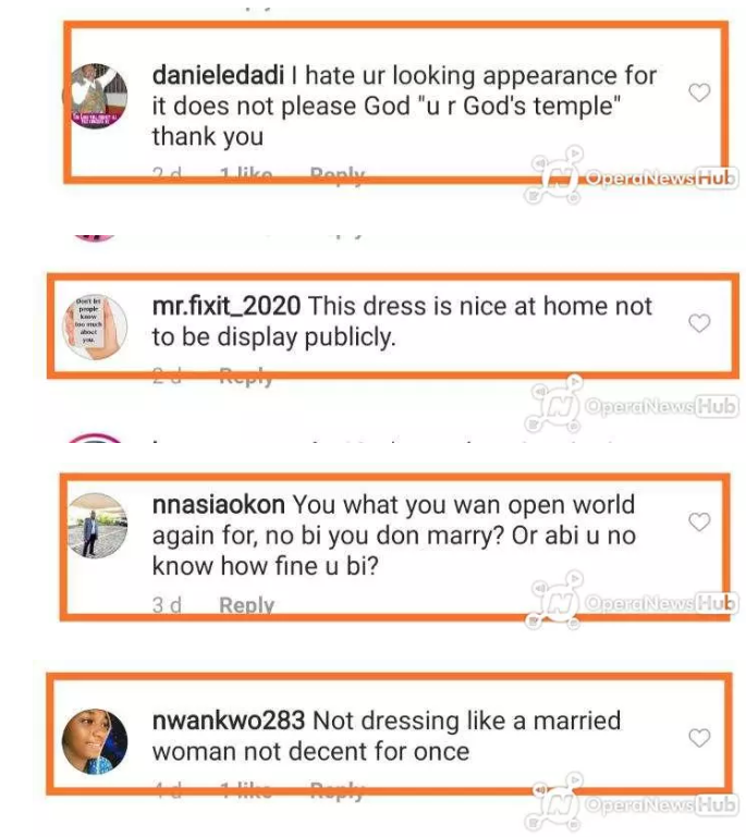 Starrboycrew wrote; Dear Regina, as a married woman, do not dress like this. I think you've forgotten that you're married. You expose your body to the public, what are you trying to achieve? Respect the old man. Don't post these kinds of things on the internet.